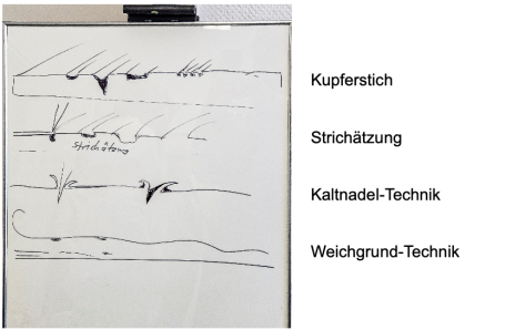 Anhand verschiedener Abzüge lassen sich die unterschiedlichen Herstellungs-techniken dann erläutern und auch mittels einer Filmsequenz über den Arbeitsablauf beim Druck alter Radierplatten von Heinrich Vogeler (1872-1942) auf Seide, einem ganz aktuellen Projekt.